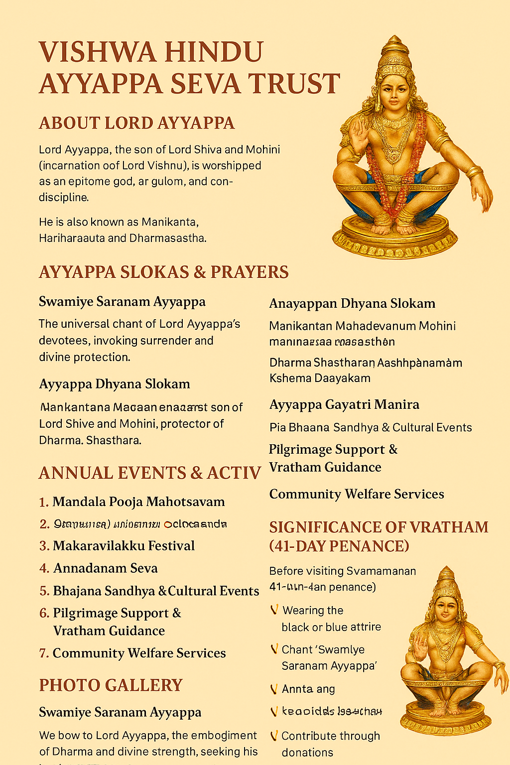 Vishwa Hinduu Ayyappa Seva Trust is a devoted religious and charitable organization dedicated to preserving and promoting the rich spiritual heritage of Hinduism, with a special reverence to Lord Ayyappa. Our mission is to serve humanity through acts of compassion, selfless service, and spiritual guidance.